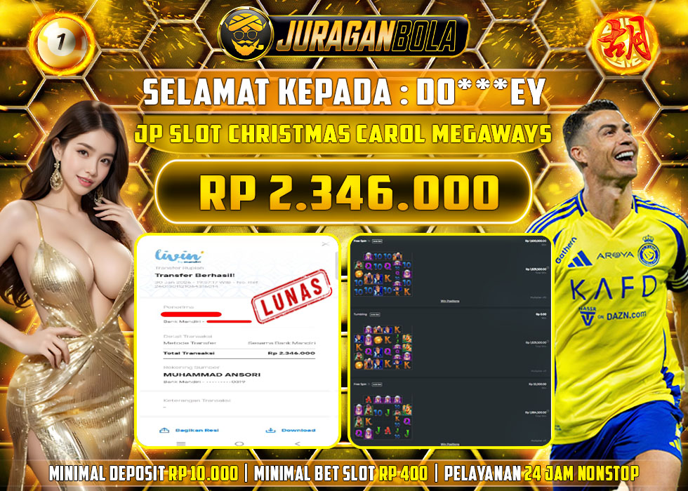 Selamat kepada user id: DO***EY telah berhasil mendapatkan kemenangan pada permainan CHRISTMAS CAROL MEGAWAYS dengan kemenangan sebesar Rp.2.346.000, Setelah mengisi formulir withdraw dengan kurang waktu 3-10 menit pihak JURAGANBOLA sudah melakukan transfer kepada pemilik userid dan dana sudah dapat dicairkan oleh pemenang. Bukti pembayaran yang kami berikan merupakan bukti pembayaran yang SAH / VALID yang langsung didapatkan melalui tanda transfer transaksi dari bank resmi indonesia.