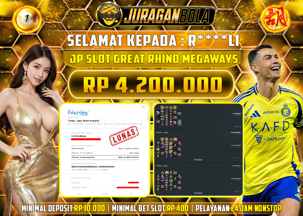Selamat kepada user id: R****LI telah berhasil mendapatkan kemenangan pada permainan GREAT RHINO MEGAWAYS dengan kemenangan sebesar Rp.4.200.000, Setelah mengisi formulir withdraw dengan kurang waktu 3-10 menit pihak JURAGANBOLA sudah melakukan transfer kepada pemilik userid dan dana sudah dapat dicairkan oleh pemenang. Bukti pembayaran yang kami berikan merupakan bukti pembayaran yang SAH / VALID yang langsung didapatkan melalui tanda transfer transaksi dari bank resmi indonesia.