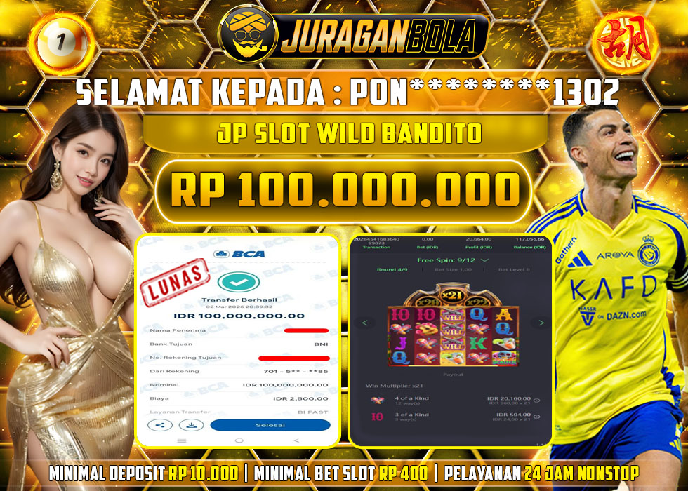 Selamat kepada user id: PON********1302 telah berhasil mendapatkan kemenangan pada permainan PGSOFT WILD BANDITO dengan kemenangan sebesar Rp.100.000.000, Setelah mengisi formulir withdraw dengan kurang waktu 3-10 menit pihak JURAGANBOLA sudah melakukan transfer kepada pemilik userid dan dana sudah dapat dicairkan oleh pemenang. Bukti pembayaran yang kami berikan merupakan bukti pembayaran yang SAH / VALID yang langsung didapatkan melalui tanda transfer transaksi dari bank resmi indonesia.