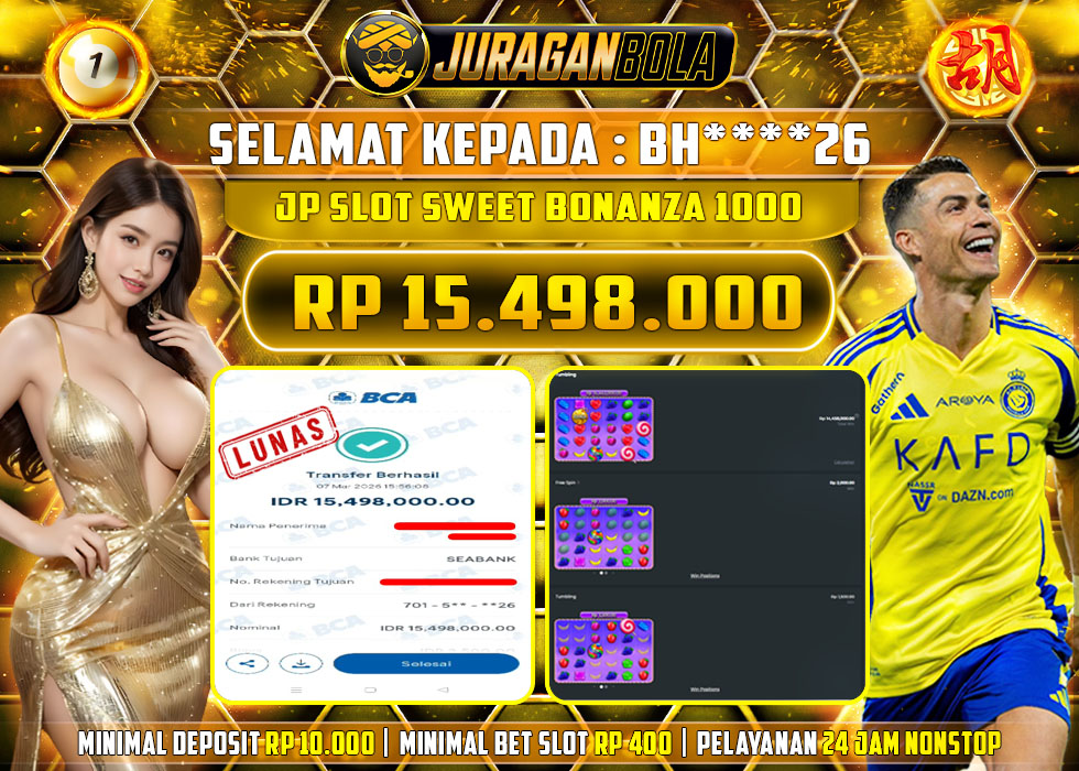 Selamat kepada user id: A***19 telah berhasil mendapatkan kemenangan pada permainan SWEET BONANZA dengan kemenangan sebesar Rp.6.000.000, Setelah mengisi formulir withdraw dengan kurang waktu 3-10 menit pihak JURAGANBOLA sudah melakukan transfer kepada pemilik userid dan dana sudah dapat dicairkan oleh pemenang. Bukti pembayaran yang kami berikan merupakan bukti pembayaran yang SAH / VALID yang langsung didapatkan melalui tanda transfer transaksi dari bank resmi indonesia.