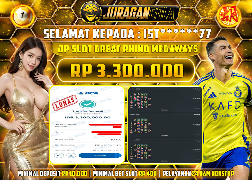 Selamat kepada user id: IST******77 telah berhasil mendapatkan kemenangan pada permainan GREAT RHINO MEGAWAYS dengan kemenangan sebesar Rp.3.300.000, Setelah mengisi formulir withdraw dengan kurang waktu 3-10 menit pihak JURAGANBOLA sudah melakukan transfer kepada pemilik userid dan dana sudah dapat dicairkan oleh pemenang. Bukti pembayaran yang kami berikan merupakan bukti pembayaran yang SAH / VALID yang langsung didapatkan melalui tanda transfer transaksi dari bank resmi indonesia.