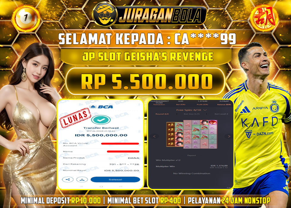 Selamat kepada user id: CA****99 telah berhasil mendapatkan kemenangan pada permainan GEISHA'S REVENGE dengan kemenangan sebesar Rp.5.500.000, Setelah mengisi formulir withdraw dengan kurang waktu 3-10 menit pihak JURAGANBOLA sudah melakukan transfer kepada pemilik userid dan dana sudah dapat dicairkan oleh pemenang. Bukti pembayaran yang kami berikan merupakan bukti pembayaran yang SAH / VALID yang langsung didapatkan melalui tanda transfer transaksi dari bank resmi indonesia.
