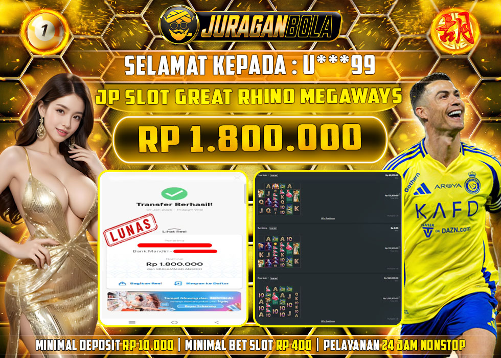 Selamat kepada user id: U***99 telah berhasil mendapatkan kemenangan pada permainan GREAT RHINO MEGAWAYS dengan kemenangan sebesar Rp.1.800.000, Setelah mengisi formulir withdraw dengan kurang waktu 3-10 menit pihak JURAGANBOLA sudah melakukan transfer kepada pemilik userid dan dana sudah dapat dicairkan oleh pemenang. Bukti pembayaran yang kami berikan merupakan bukti pembayaran yang SAH / VALID yang langsung didapatkan melalui tanda transfer transaksi dari bank resmi indonesia.