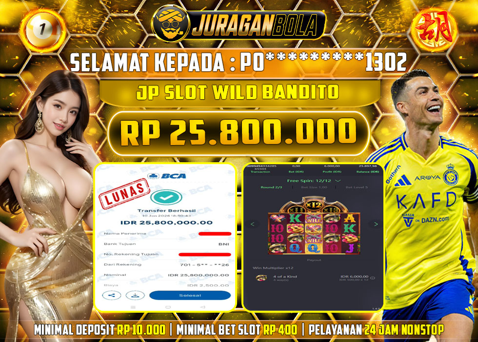 Selamat kepada user id: PO*********1302 telah berhasil mendapatkan kemenangan pada permainan WILD BANDITO dengan kemenangan sebesar Rp.25.800.000, Setelah mengisi formulir withdraw dengan kurang waktu 3-10 menit pihak JURAGANBOLA sudah melakukan transfer kepada pemilik userid dan dana sudah dapat dicairkan oleh pemenang. Bukti pembayaran yang kami berikan merupakan bukti pembayaran yang SAH / VALID yang langsung didapatkan melalui tanda transfer transaksi dari bank resmi indonesia.
