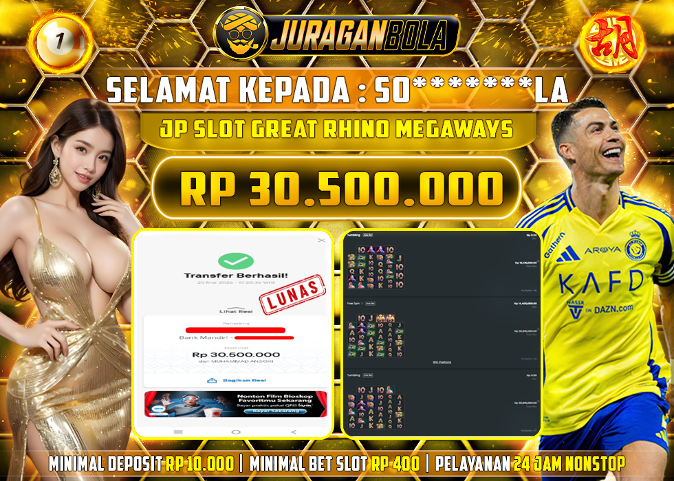 Selamat kepada user id: SO*******LA telah berhasil mendapatkan kemenangan pada permainan GREAT RHINO MEGAWAYS dengan kemenangan sebesar Rp.30.500.000, Setelah mengisi formulir withdraw dengan kurang waktu 3-10 menit pihak JURAGANBOLA sudah melakukan transfer kepada pemilik userid dan dana sudah dapat dicairkan oleh pemenang. Bukti pembayaran yang kami berikan merupakan bukti pembayaran yang SAH / VALID yang langsung didapatkan melalui tanda transfer transaksi dari bank resmi indonesia.
