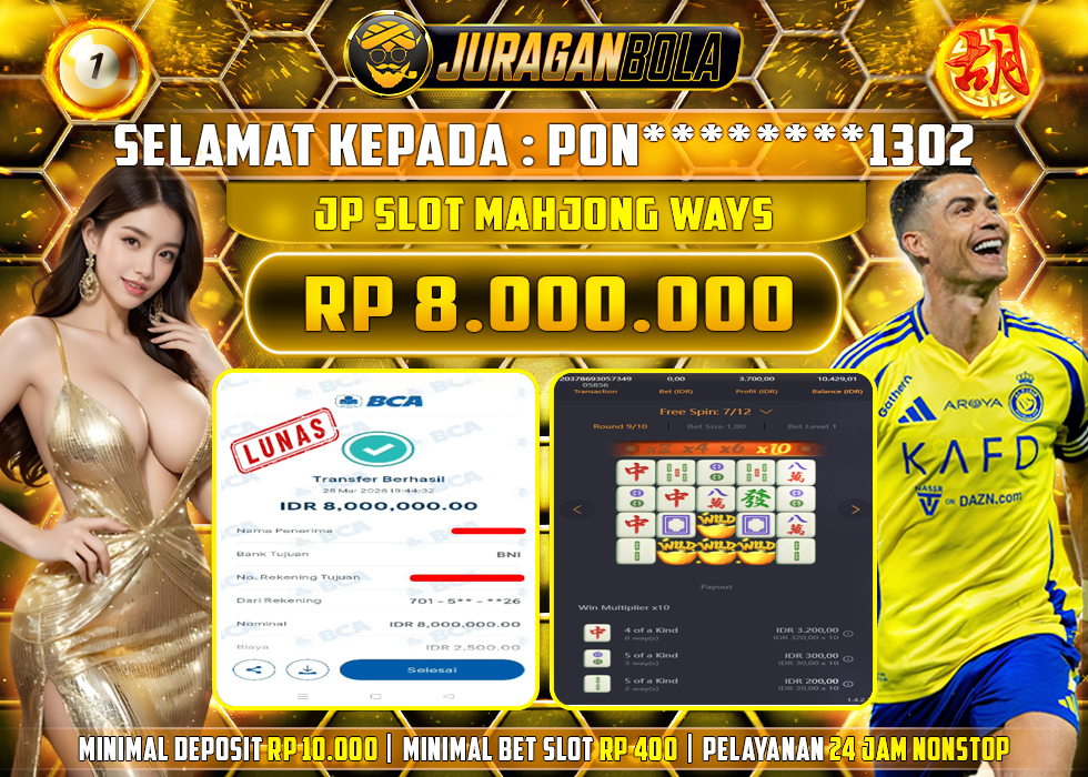 Selamat kepada user id: PON********1302 telah berhasil mendapatkan kemenangan pada permainan MAHJONG WAYS dengan kemenangan sebesar Rp.8.000.000, Setelah mengisi formulir withdraw dengan kurang waktu 3-10 menit pihak JURAGANBOLA sudah melakukan transfer kepada pemilik userid dan dana sudah dapat dicairkan oleh pemenang. Bukti pembayaran yang kami berikan merupakan bukti pembayaran yang SAH / VALID yang langsung didapatkan melalui tanda transfer transaksi dari bank resmi indonesia.