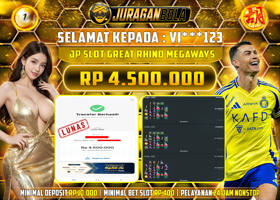 Selamat kepada user id: VI***123 telah berhasil mendapatkan kemenangan pada permainan GREAT RHINO MEGAWAYS dengan kemenangan sebesar Rp.4.500.000, Setelah mengisi formulir withdraw dengan kurang waktu 3-10 menit pihak JURAGANBOLA sudah melakukan transfer kepada pemilik userid dan dana sudah dapat dicairkan oleh pemenang. Bukti pembayaran yang kami berikan merupakan bukti pembayaran yang SAH / VALID yang langsung didapatkan melalui tanda transfer transaksi dari bank resmi indonesia.